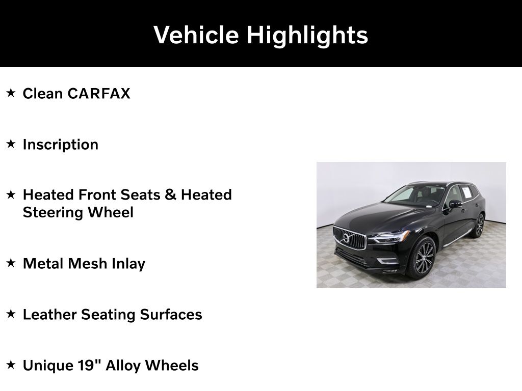 Discover the exceptional 2019 Volvo XC60 T5 Inscription, a premium midsize SUV that seamlessly blends style, performance, and advanced technology. This stunning Black beauty boasts a commanding presence on the road, with its sleek lines and distinctive Volvo design cues.